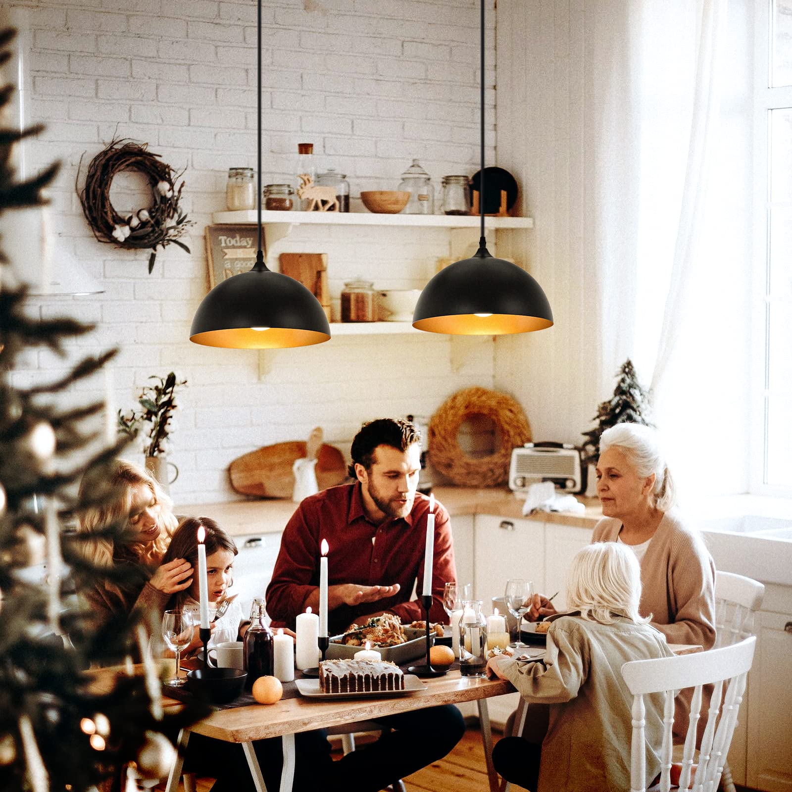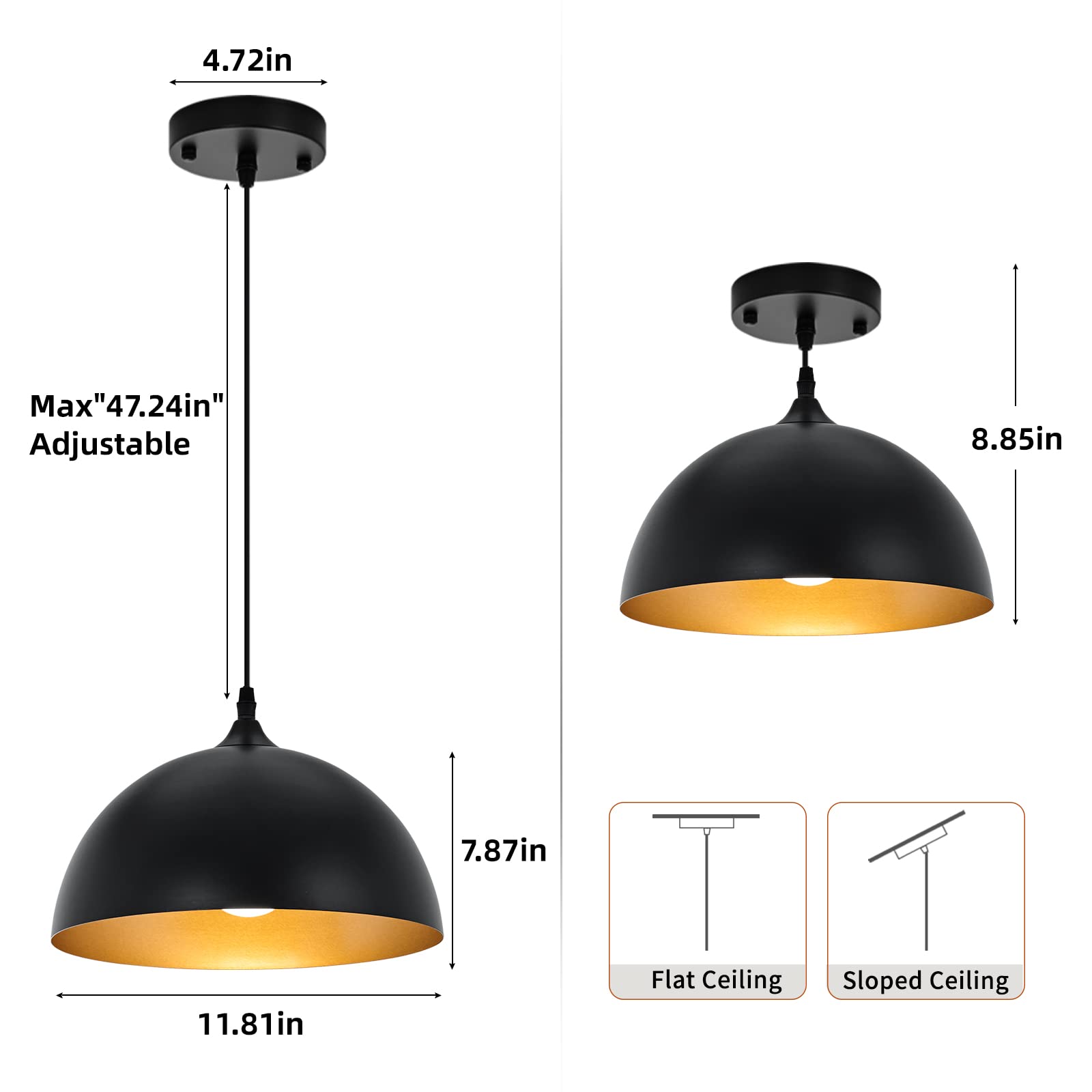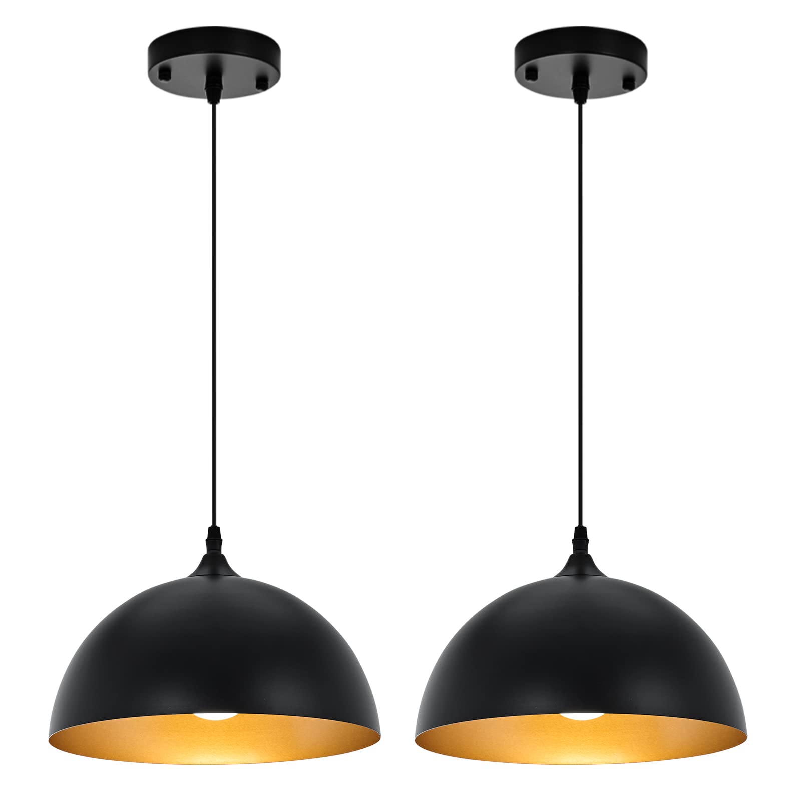 Farmhouse Pendant Lighting for Kitchen Island,Black and Gold Dome Pendant Light Fixtures, Industrial Hanging Ceiling Light for Dining Room Foyer Cafe Kitchen Sink,2 Pack